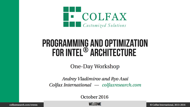 We are making publicly available the slide deck of the Colfax developer training titled “Parallel Programming and Optimization with Intel Architecture“.